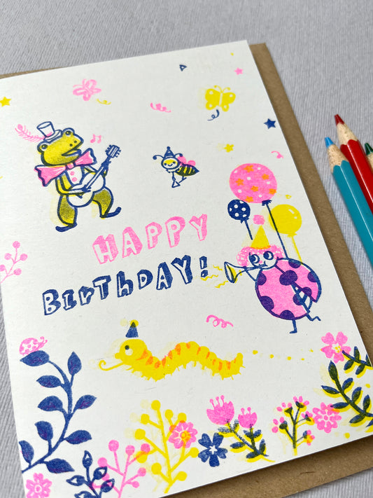 • Birthday bugs party - A6 risograph greeting Card - congratulations birthday card