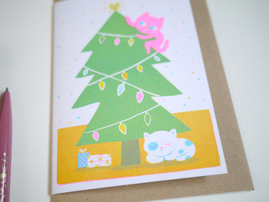 Happy Holiday kitty Xmas tree - A6 risograph cute cats Catsmas holidays Card