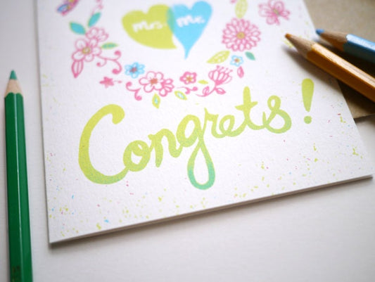 Mr. and Mrs love birds - hand printed Just married, wedding congratulations Card